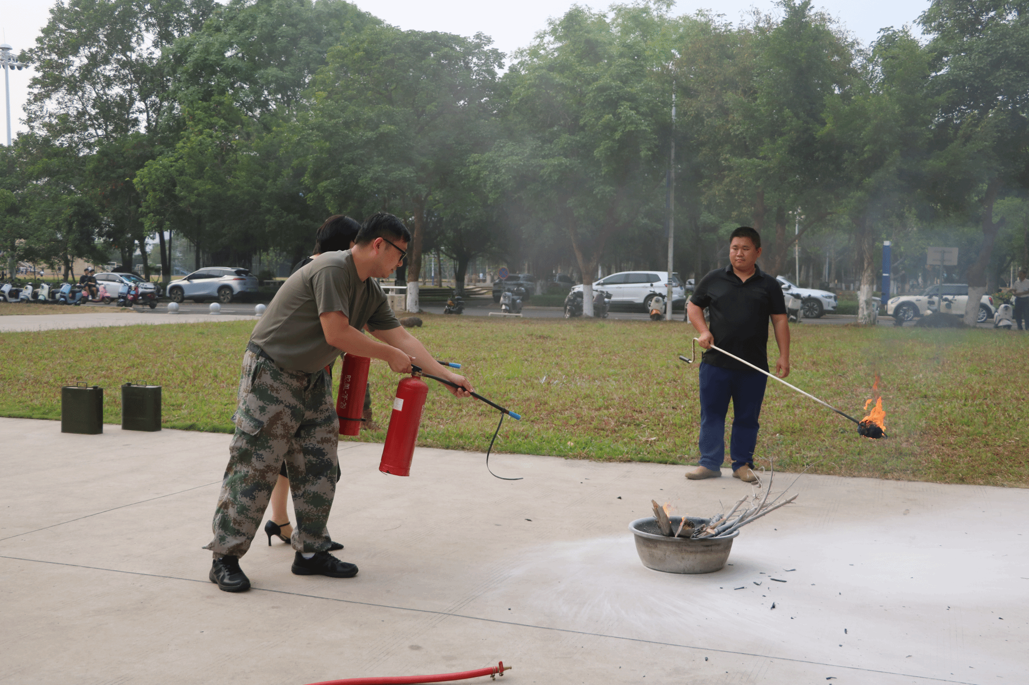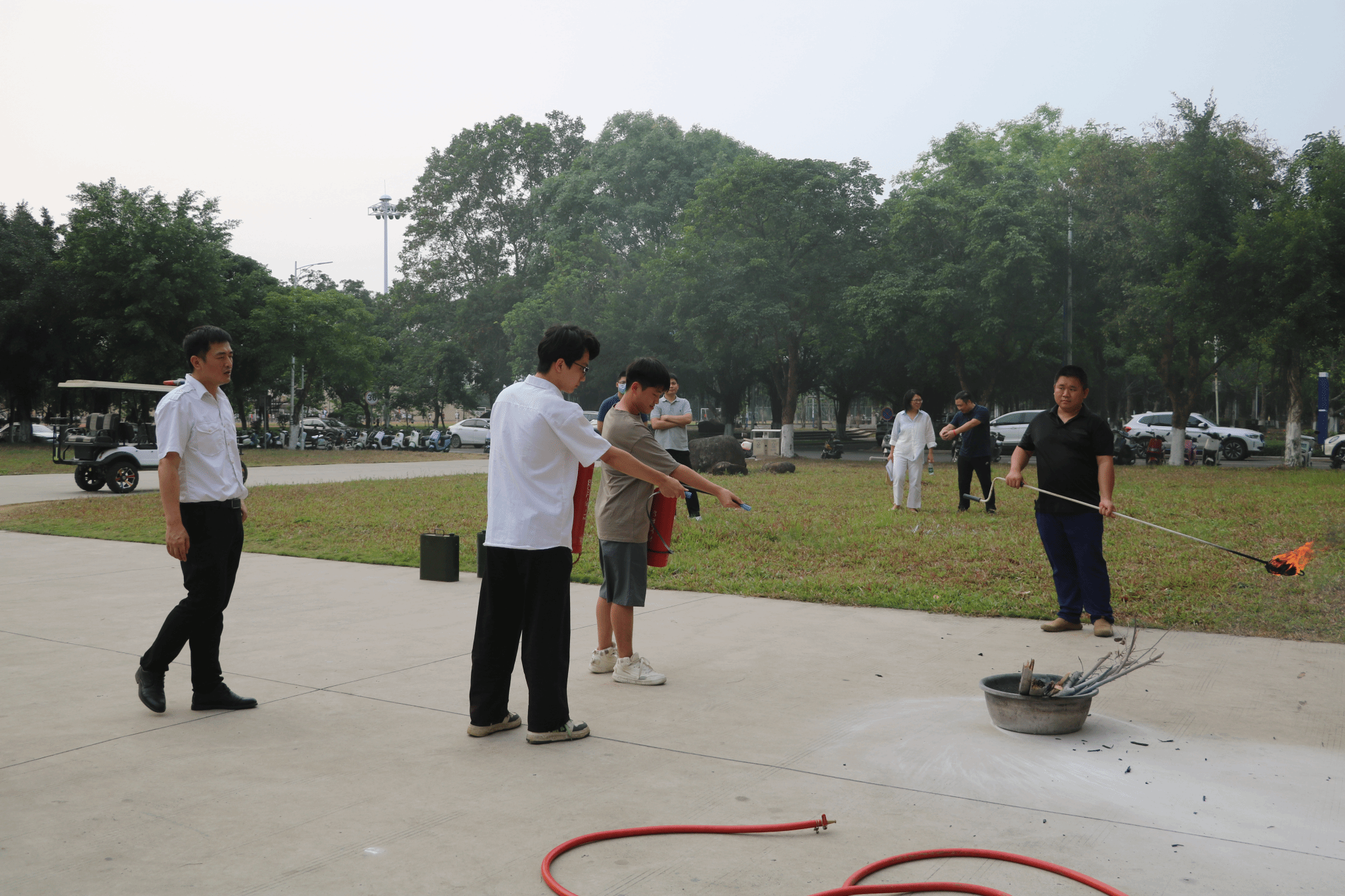 教职工认真倾听讲解员的消防知识培训,围绕校园、宿舍、办公区域防火灭火要点展开讨论,实际操作各种消防器材的使用,并在第六教学楼实地开展了灭火和应急疏散演练。