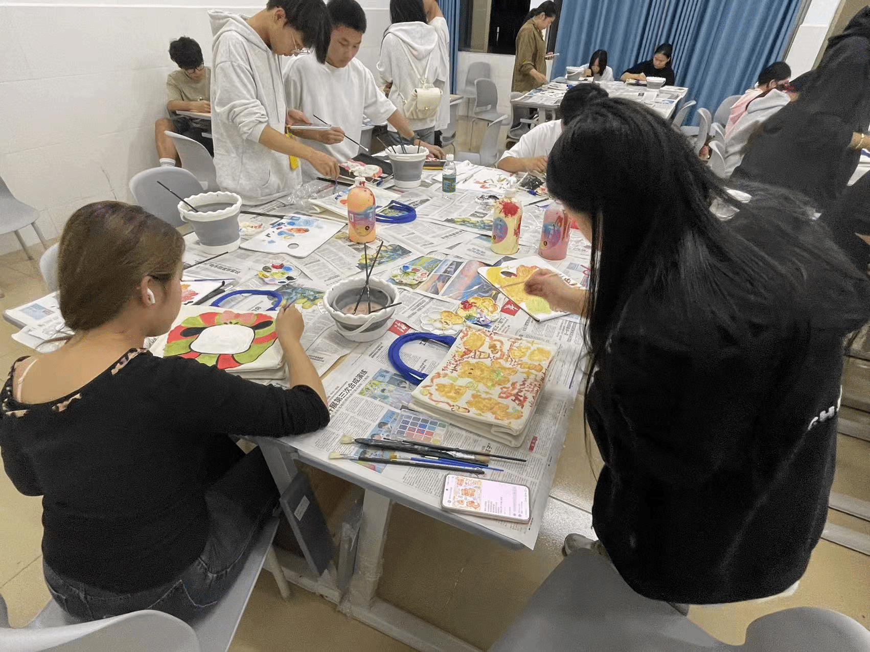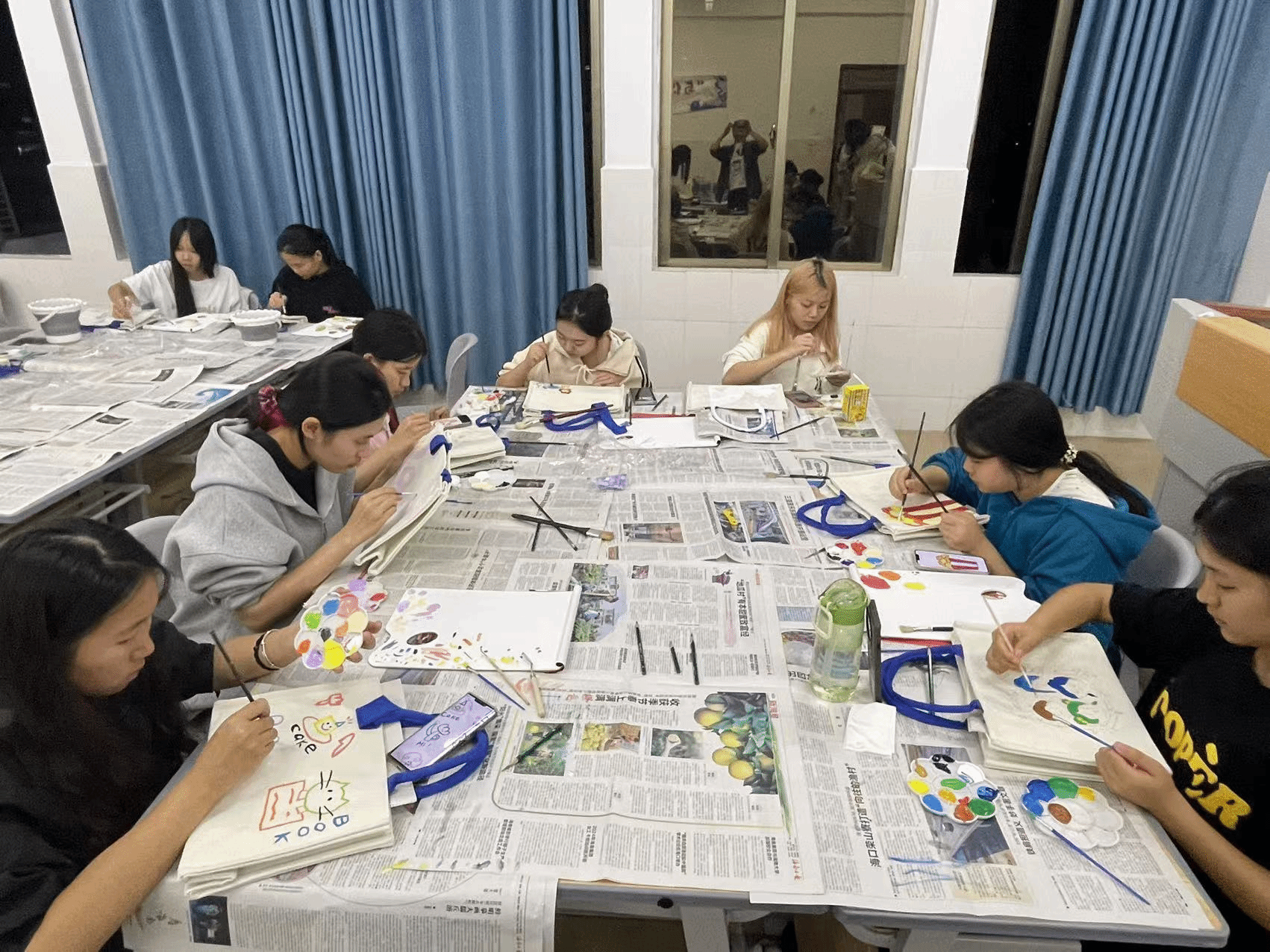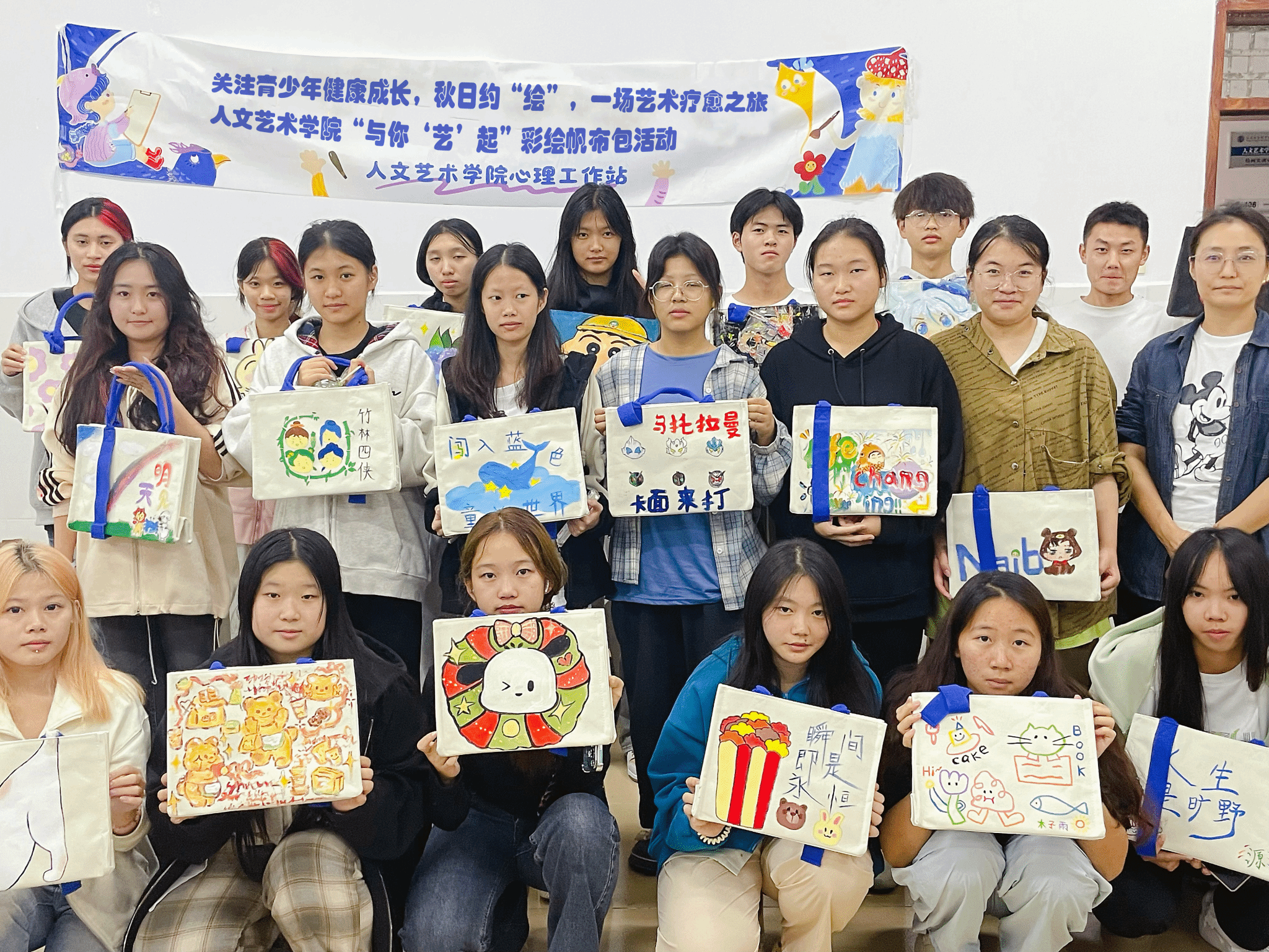 活动中,同学们伴随着轻柔的音乐,积极进行自我情绪探索,在空白的帆布袋上自由创作,有的同学用画笔描绘出心中的理想世界,有的同学则借助绘画表达自己的情感与困惑。同学们表示,在创作过程中他们逐渐感受到内心的宁静,活动让他们更加积极主动放松 ,更具活力。
