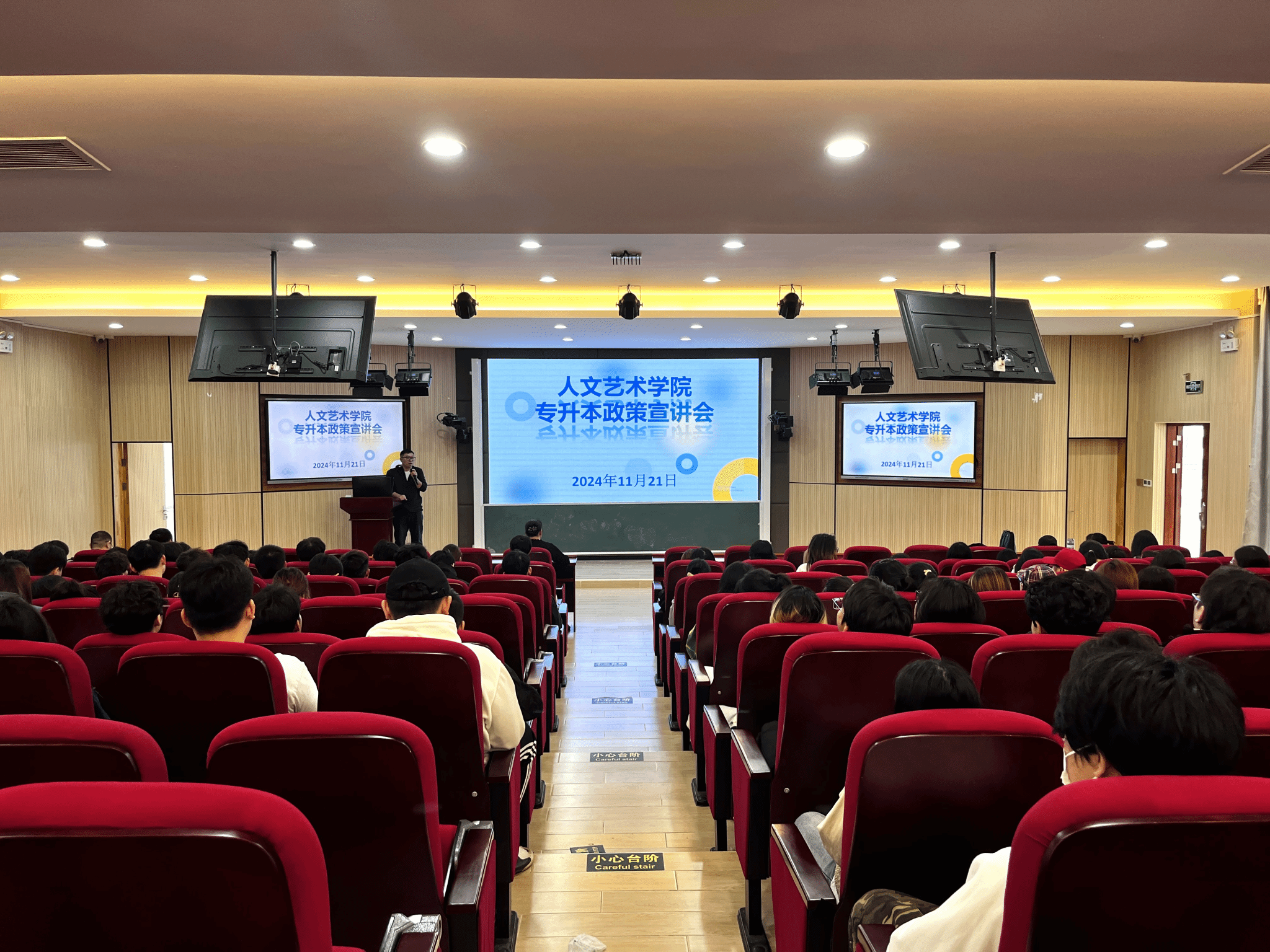 根据公司招生与就业创业处的工作安排,在公司党总支的指导下,2024年11月21日,院学工办组织召开专升本政策宣讲会,公司共425名2025届毕业生参加,宣讲会由学工办副主任徐超主持。