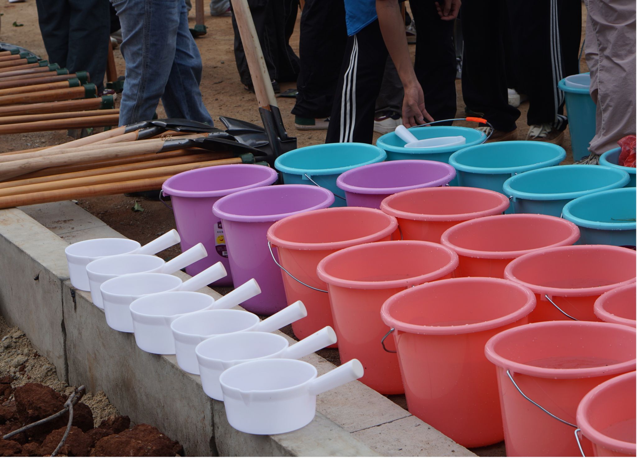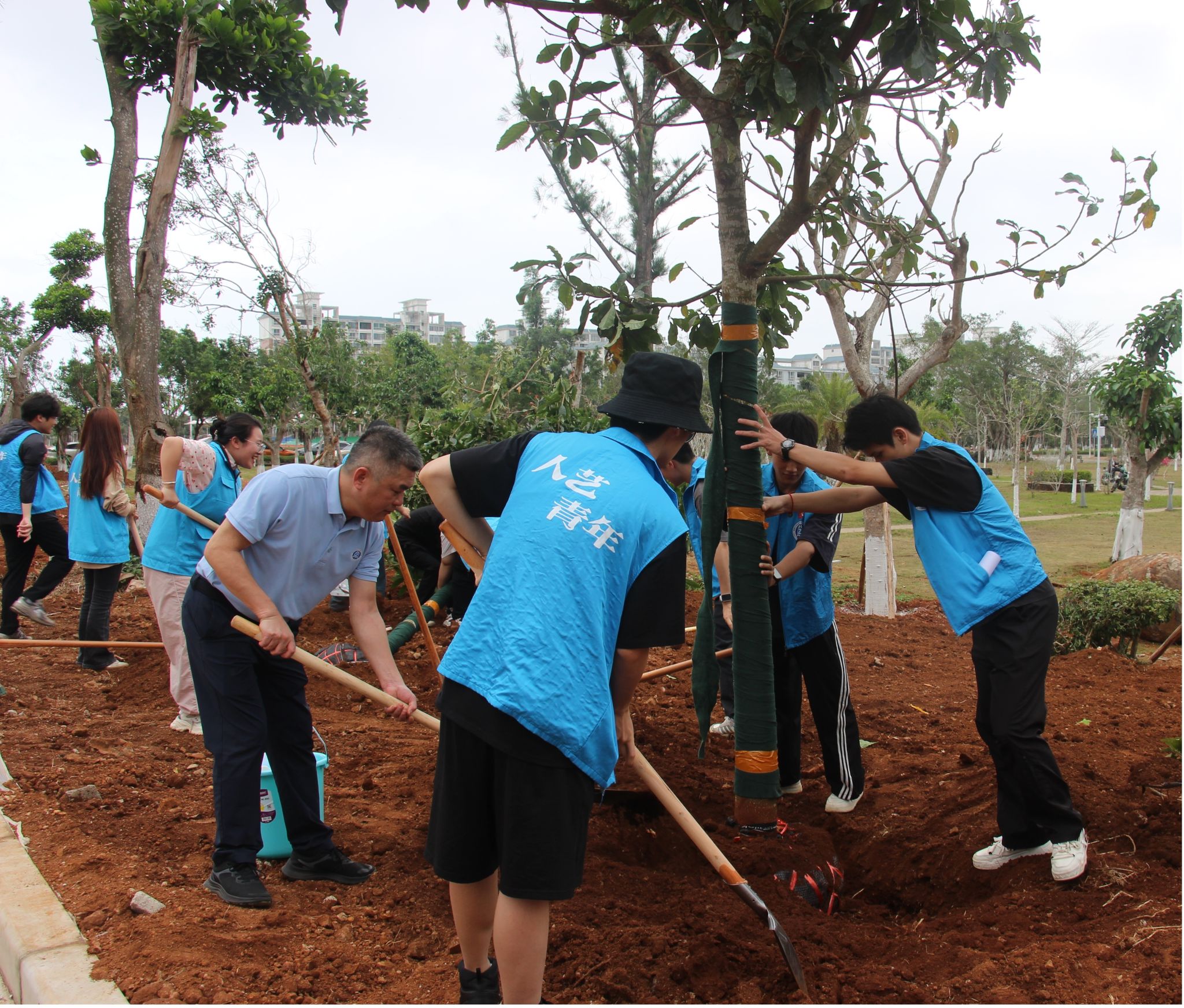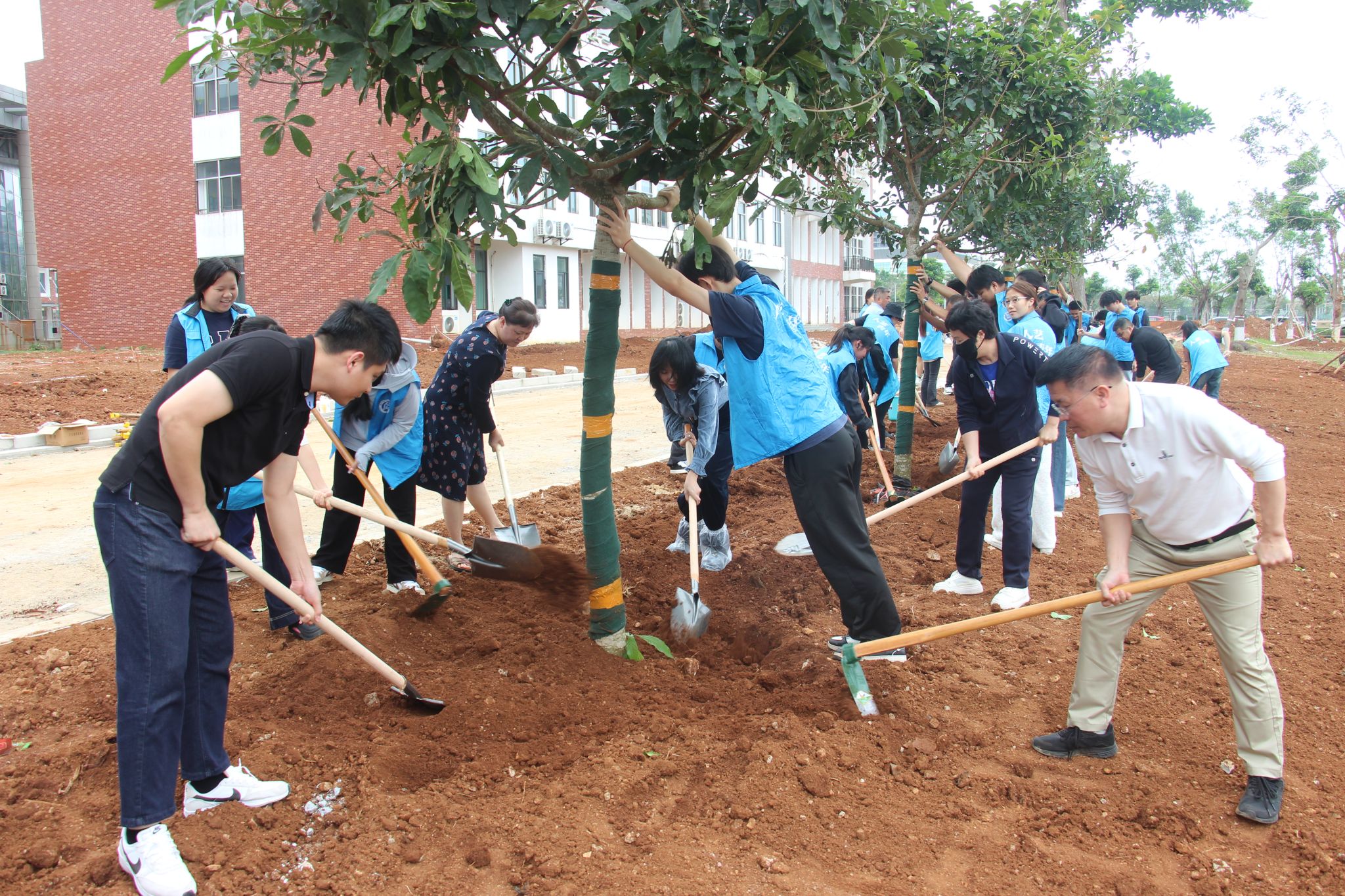 活动现场,师生们热情高涨,分工明确,干劲十足。有的挥锹铲土,有的扶苗填坑,有的提水浇灌,每一个环节都衔接有序,配合默契。“先把树苗扶正,再填土,一定要踩实咯!”“水多浇点,让小树苗喝饱!” 大家一边劳动,一边交流着植树的技巧和心得,植树现场温馨和洽,其乐融融。