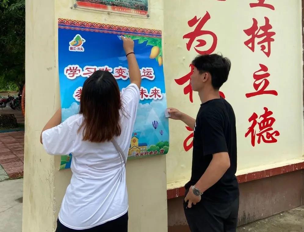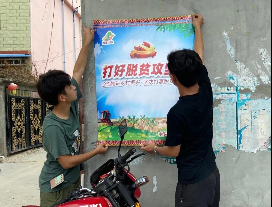 2020年8月12日,伟德体育脱贫攻坚战青年宣传员实践团队来到本次活动的第二站也是最后一站——昌江黎族自治县石碌镇水头村,深入少数民族自治县脱贫工作队伍,了解其少数民族脱贫工作的内容,协助做好村内文明标语宣传,发挥专业特长助力打赢脱贫攻坚战。