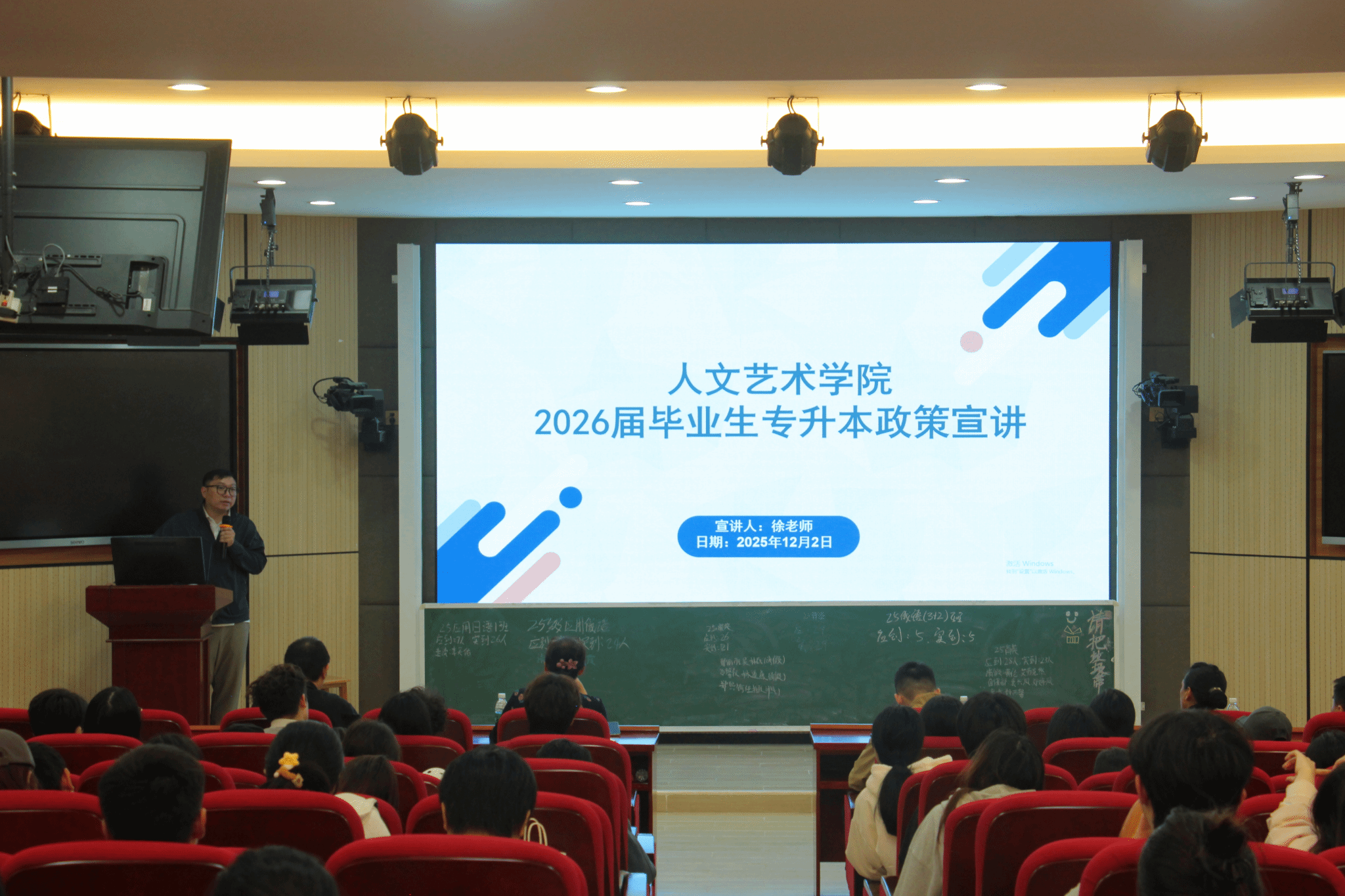 根据公司招生与就业创业处的工作安排,在公司党总支的指导下,2025年12月2日,院学工办在1-421教室组织召开专升本政策宣讲会,公司共446名2026届毕业生参加,宣讲会由学工办副主任徐超主持。