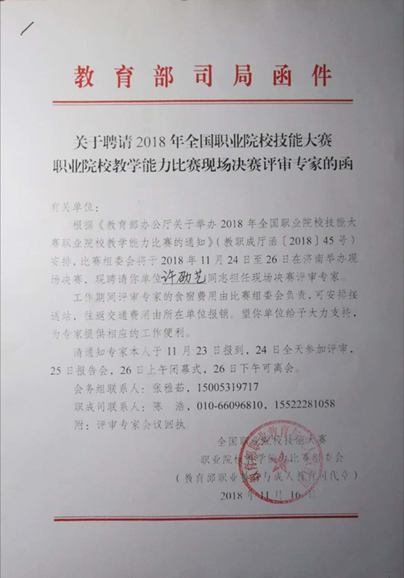 公司伟德体育许劭艺经理为教育部职业院校艺术设计类专家教学指导委员会委员、全国包装职业公司产品指导委员会委员,此次受聘荣任大赛现场决赛评审专家,在发挥公司全国骨干职业院校引领职能的同时,也大大提升了公司社会知名度,还将对公司善用教育信息技术、创新教学方式方法、改进教学的氛围、提升教学能力,加速推进公司的教学信息化建设、推动广大教师研究教学法、坚持工匠精神和问道解惑等方面发挥非常重要作用。